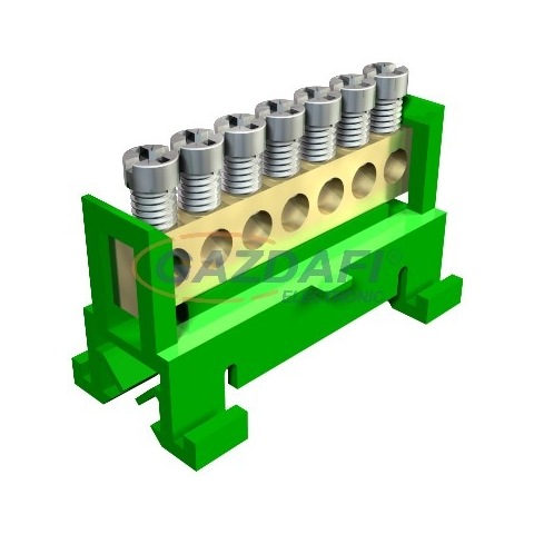 A kép illusztráció! Védővezető csatlakozóblokk 7 kapocshellyel 16 mm²-ig. Nikkelezett sárgaréz szorítósín, galvanikusan horganyzott és átlátszóra passzivált acélcsavarok, MSZ EN 50022 szerinti 35 mm-es kalapsínekre (keresztben) vagy 10 x 2-2,5 mm-es la