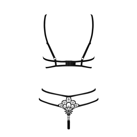 Obsessive Badossa kétrészes szett (fekete) Szinte teljes egészében, kissé fényes, fekete, rugalmas pántokból álló kétrészes szett. Minden lényeges ponton méretre is állíthatók, a merevítős kosárral rendelkező melltartó hátul 2x3 elemből álló kapocssoro