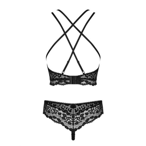 Obsessive Giully kétrészes szett. Áttetsző, damasztos, leginkább a párducbőr mintázatára emlékeztető, rugalmas anyagból készült összeállítás. A felső rugalmas és méretre állítható dupla vállpántjai hátul keresztbe futnak. A kapcsos részén 3x3-as kapocs