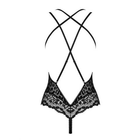Obsessive Giully body. Áttetsző, damasztos, leginkább a párducbőr mintázatára emlékeztető, rugalmas anyagból készült body, melynek méretre állítható dupla vállpántjai hátul keresztbe futnak, a hátat szinte teljesen szabadon hagyva. Mérete: S-MAnyaga: 9