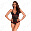 Obsessive Rossita body. Áttetsző, virágmintás anyagból készült, hátul szinte teljesen nyitott body, szatén szalagos, megkötős nyakpánttal. A mellek alatt rugalmas, gumis pántot találunk ami plüssös tapintású, a hátul, a melltartóknál megszokott dupla k