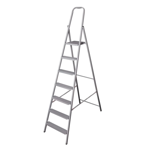 Praktikus kis tömegű 7 lépcsős összecsukható létra, otthoni ház körüli munkavégzéshez. - Létra kialakítás: Egyoldalas - Fokok száma: 7 db - A maximális terhelés: 150 kg - Súly: 9.4 kg - Anyaga: acél