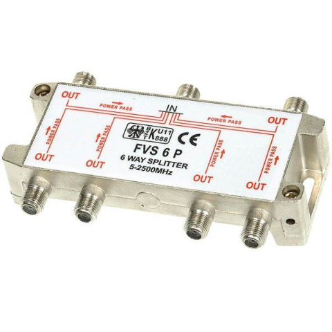 Elosztó 6 kimenettel, male csatlakozó: 7× koaxiális csatlakozó (F), egyenes végződés Kiváló minőségű koax elosztó műholdvevőkhöz és parabolaantennákhoz. Az eszköz segítségével egy kábel 6 kimenetre osztható. Ennél a verziónál az áram minden irányban áramlik. Az elosztó
