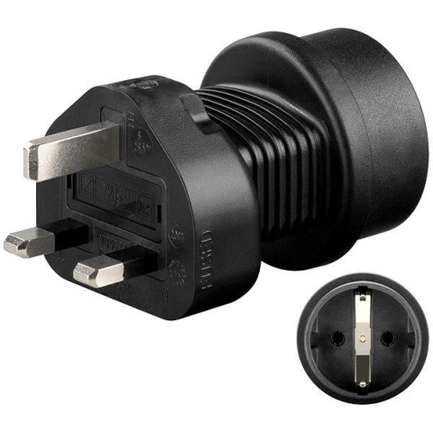 Utazó adapter - európai szabványú az Egyesült Királyságban való használathoz , 250V / 5A, földeléssel Goobay adapter utazáshoz, az Egyesült Királyságban használatos foglalathoz és európai szabványú csatlakozókkal rendelkező készülékekhez. Az adapter lehetővé teszi a legtöbb Európában gyártott fogyaszt