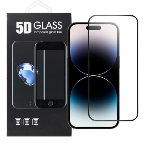 1 kép OEM iPhone 14 Pro üvegfólia, tempered glass, előlapi, 5D, edzett, hajlított, fekete kerettel