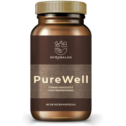PureWell béltisztító gyógynövény-komplex. Összetevők: Bibitaki Indiai egres Kínai rebarbara Sárga mirobalán Ánizs Bojtorján Ezerjófű Fehér mályva Örménygyökér Sárga tárnics Papaya Bo...