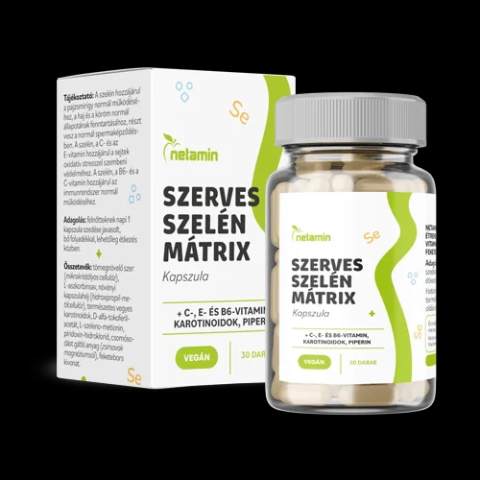 Netamin Szerves Szelén Mátrix kapszula 30 kapszula Termékjellemzők: • 100 µg szerves szelén (L-szeleno-metionin) a napi adagban • A szelén hatását és felszívódását támogató extra ö...