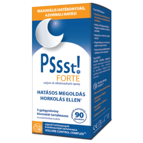 "Pssst!® FORTE Horkolásgátló szájspray VOLUME CONTROL COMPLEXTM egyedi hatóanyagok kombinációját tartalmazza: orvosi szemvidítófű, bazsalikom, tömjénfa, komló, panthenol, zsálya, eukaliptusz illóol...
