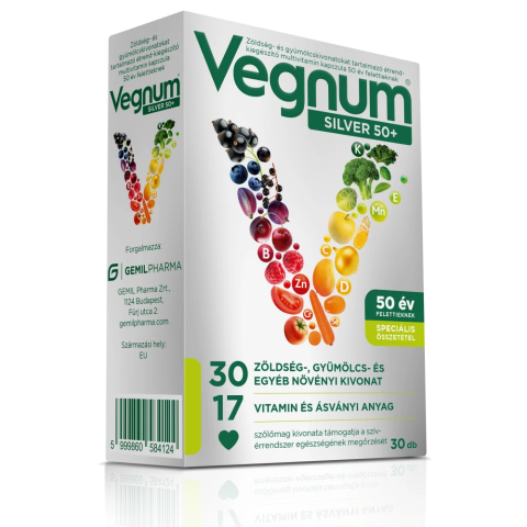 Vegnum Silver 50+, a modern kor immuntámogató készítménye 50 év felettiek számára fejlesztett speciális összetétellel. 29 zöldség-, gyümölcs- és egyéb növény antioxidánsokban gazdag kivonatával a s...