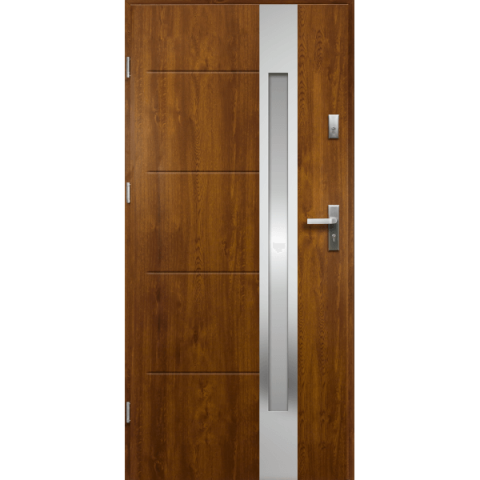 1 kép OK DOORS ARIADNA HOMOKFÚVOTT ACÉL BEJÁRATI KÜLTÉRI AJTÓ, BALOS ARANYTÖLGY SZÍNBEN