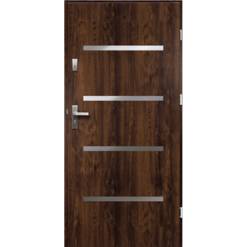 Az ajtó szárnyvastagsága 55 mm préselt acéllemez. Szigetelése habosított polisztirol. Lemez vastagsága: ( ajtó keret/ajtólap ) - 1,2 mm/0,6 mm. Felülete UV álló PVC dekorfóliával van bevonva. Az ajtó 2 független zárszerkezettel, valamint 3 állítható zsanérral van felszerelve, 180 fokos nyitási tartományban nyitható. Tömítés a keretben és a küszöbön. A beépítési egységcsomag tartozék: 011-es kilincs, 03-as zárbetét.