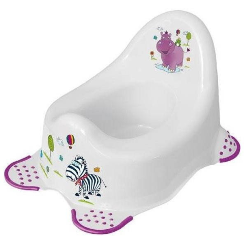 Bili - műanyag, ergonomikus kialakítás, csúszásgátlós, magasított háttámla, alkalmas 10 hónapos kortól, teherbírás 15 kg, méretek 26 × 25 × 36 cm (Ma×Sz×Mé) Anatómiailag formált edény vidám képeket víziló és a zebra. A magas háttámla biztosítja a gyermek kényelmes legyen.Anatómiailag formált gyermek bili, vidám víziló és a zebra képekkel. A magas háttámla