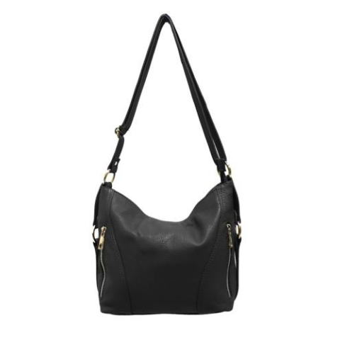 Agnese szarvasmarha bőrből készült fekete bőr válltáska. Cipzárral zárható. Belül középen található egy cipzárral zárható tároló, valamint egy cipzáros zseb, telefontartó zseb. A táska külső oldalán is van egy cipzárral zárható zseb.