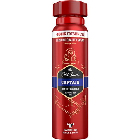 Dezodor - férfi, spray kivitel, zsíros, normál, kombinált, száraz és érett bőrre ajánlott, frissítő illattal, védő, mindennapi használatra, alumíniummentes, 150 ml-es kiszerelésben Dezodor spray Old Spice Captain friss, felejthetetlen illattal, elsősorban férfiaknak. Akár 48 órán keresztül biztosítja a friss illatot a hónaljban. Légy részese a frissességnek, bármit is