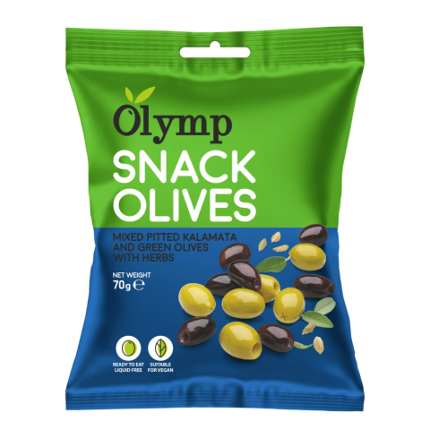 Olymp snack fűszerezett zöld és kalamata magozott olajbogyó 70 g Kalamata magozott olajbogyó. Összetevők: (oliva, só borecet) Zöld olajbogyó:( olajbogyó, só, savanyúságot szabályzó anyag: citrom sav, antioxidáns: aszkorbin sav), napraforgóolaj, fűsze