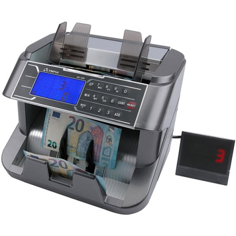 Bankjegyszámláló - válogatott bankjegyeket, étkezési utalványokat stb. számlál, 1000 bankjegy/perc, bemenet 300 bankjegyre, lehetőség UV, MG, MT, DD és IR ellenőrzésre a bankjegyeknél, számlálás, összeadás, adagolás, automatikus és kézi indítás funkciók Az Olympia NC 455 egy többfunkciós számláló, amely nemcsak megszámolja a bankjegyeket, hanem az eredetiségüket is ellenőrizni tudja. Az ultraibolya vagy mágneses biztonsági elemeket tartalmazó ba