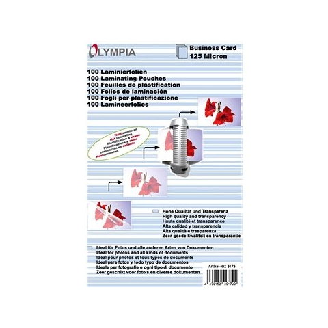 Lamináló fólia - 60x95 mm, 100 darab a csomagban, névjegykártyák laminálására, fólia vastagsága 125 mikron, fényes, laminálás módja meleg, alkalmas bármely típusú asztali laminálógéphez és dokumentum megjelenésének kiemelése A népszerű Olympia névjegykártyákra / 250 fényes - csomag 100 db lamináló fólia alapvető előnyei A fényes felületű Olympia Germany lamináló fólia növeli a dokumentumok tartósságát és időtállóságát Meg