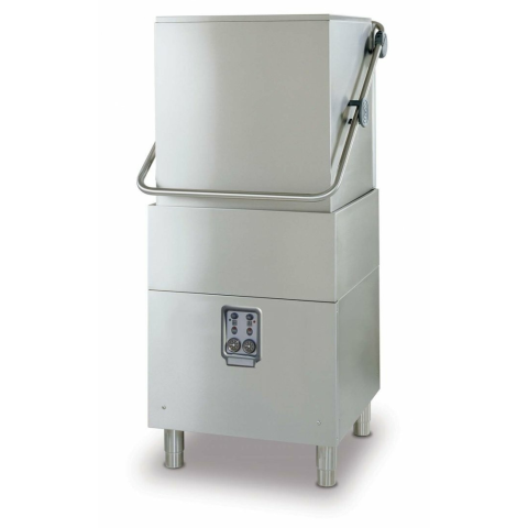 Átfutó rendszerű kalapos mosogatógép tankfilterrel és öblítőszer adagolóval, Opcionálisan rendelhető: ürítőszivattyú, mosószer adagoló, inox tank filter és inox mosó karok Ciklusidő: 60/120/180 mp. Hasznos belmagasság: 43 cm Kapacitás: 3000-1500 pohár/óra; 1080-540 tányér/óra Kosárméret: 50x50 cm Mosószivattyú kapacitása: 840Lt/perc Mosótér kapacitás: 55 l Bojlerkapacitás: 9 l Mosási/öblítési hőmérséklet: 55°C/85°C Teljesítmény: 7