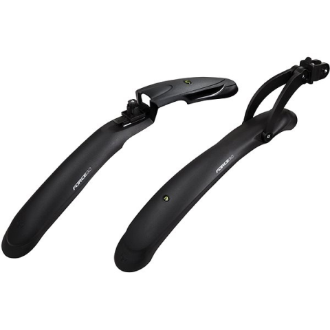 Bicikli sárvédő - első és hátsó, kerékvillára, nyereg alá, 29" kerék átmérőhöz, állítható dőlés, anyaga műanyag, fekete kivitel A Force One 3.0 elülső és hátulsó sárvédői 24"-29" méretű kerekekhez készültek. A sárvédők megakadályozzák, hogy a felfröccsenő sár és szennyeződések beszennyezzék a kerékpáros ruháját, még kellemetle