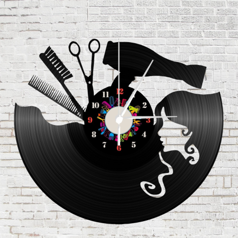 Fodrászkellékes bakelitből készült óra: semmi nem lehet ennél varázslatosabb ajándékötlet a fodrásznak, fodrászkellékes ismerősödnek, vagy fodrászboltba.