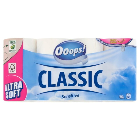 Ooops! Classic Sensitive – Toalettpapír (3 rétegű) Prémium, háromrétegű toalettpapír. Prémium puhaságú és normál tekercshosszal és lapmérettel rendelkező termék. A csomagokon könnyen nyitható sarok található. A kompakt tekercs és a kisebb átmérő miatt...