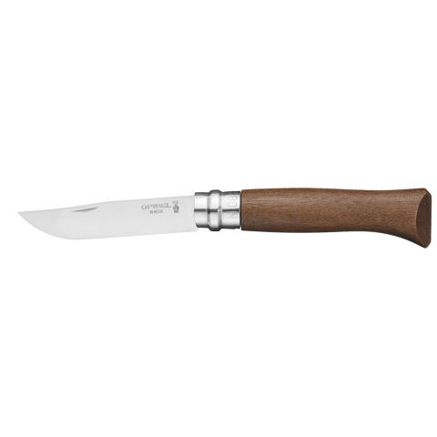 Opinel No.8 Sandvik - diófa markolattalHagyományos kialakítású francia kézműves termék. 85 mm hosszú behajtható rozsdamentes acél pengével és kiváló minőségű diófa markolattal ellátott zsebkés. A biztonságos használatról a szabadalmaztatott Virobloc b