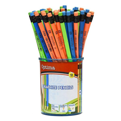 Grafitceruza OPTIMA HB háromszögletű radíros 72 darabos Háromszög grafit ceruza élénk narancssárga, kék és zöld színben, 72 db-os műanyag kínáló hengerben. Keménység: HB