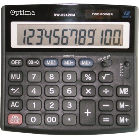 12 digites asztali számológép, megemelt kijelzővel, elemmel, és napelemmel is működtethető.