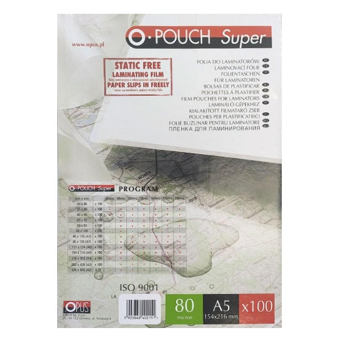 Lamináló fólia OPUS A/5 154x216mm 80 mikron fényes 100/dob Technológia: meleglaminálás. Alkalmazható: értesítések, szórólapok, fényképek laminálására