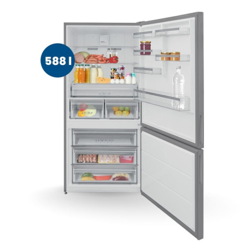 Kombinált hűtőszekrény NO FROST Orava RGO-600 Kétajtós kombinált hűtőszekrény fagyasztóval Orava RGO-600, amely teljes mértékben alkalmazkodik háztartásához, valamint köszönhetően az időtálló rozsdamentes acél kialakításának szuperül is néz ki!A teljes tiszta űrtartalma 588 liter.Az RGO-600 hűtőszekrény belseje nagyon hatékonan fel felosztva – a hűtőrész űrtartalma 407 liter, 3 keményített üveg polccal rendelkezik, praktikus fiókkal a hús és a halak