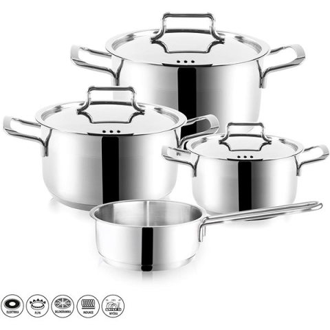 Edénykészlet - gáz, elektromos, indukciós, üvegkerámia és halogén főzőlaphoz, 3 fazék a készletben, nem éles fémeszköz használatának lehetősége, sütőben használható és mosogatógépben mosható, maximális sütési hőmérséklet a sütőben 200 °C, edény anyaga rozsdamentes acél, fazék külső felülete rozsdamentes acél, fazék belső felület rozsdamentes acél, fazék nyelének anyaga rozsdamentes acél, fedő a csomagban, ezüst kivitel Az ORION edénykészlet