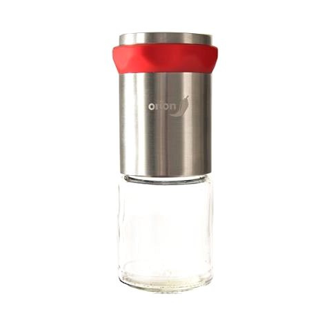 Fűszerdaráló - kézi, mosogatógépben mosható, műanyag, üveg és acél konstrukció, acél őrlőmechanizmus, mérete 14 × 5,5 cm (magasság × átmérő), tömege 210 g A kitűnő Orion Üveg/acél chili daráló ma. 14 cm egy ügyes kis fűszerdaráló amellyel sót, borsot vagy egyéb fűszereket darálhatunk. A húsok ízesítése még sosem volt ennyire egyszerű. A termék műanyag r