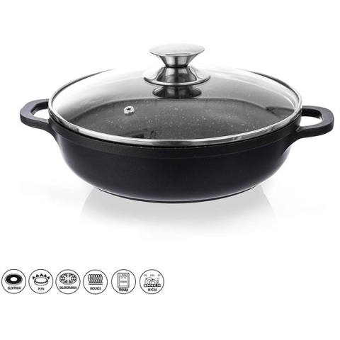 Lábas - alumínium belső felület, alkalmas gáz, elektromos, indukciós és üvegkerámia főzőlaphoz, alakja kerek, 2,5 l-es kiszerelés, alumínium fogantyúval, megerősített és szendvics fenekű, tapadásmentes felület, sütőben használható és mosogatógépben mosható, mérete 6,5 × 32 cm (Ma×Sz), átmérője 24 cm, fedő is a csomag része, fekete színben A 24 cm átmérőjű és 2,5 liter térfogatú ORION GRANDE lábas megkönnyíti az ételkészítést. A lábas tömör al