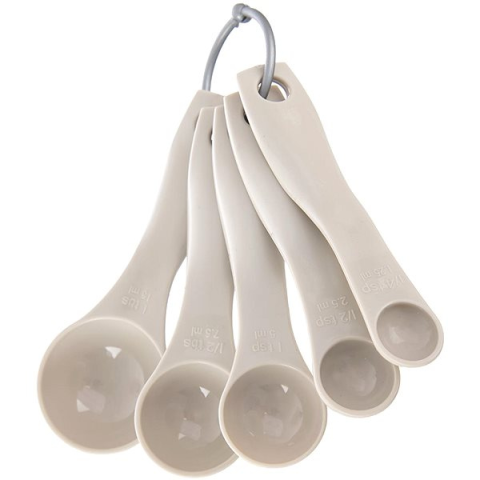 Kimérő - öt darabos készlet bézs színű műanyag mérőkanál kis mennyiségű hozzávalók pontos adagolásához főzéskor és sütéskor - 1,25 ml, 2,5 ml, 5 ml, 7,5 ml és 15 ml