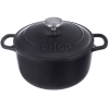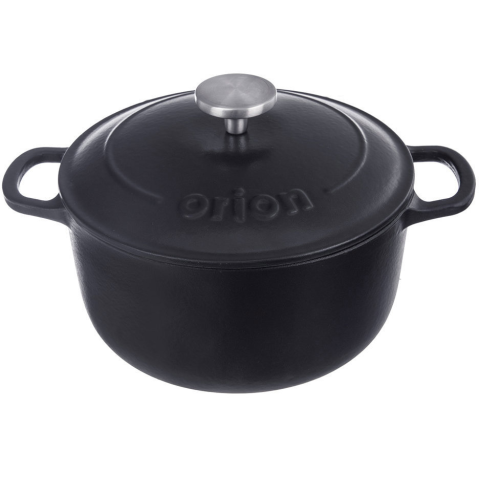 Fazék - zománcozott belső felület, alkalmas gáz, elektromos, indukciós és üvegkerámia főzőlaphoz, alakja kerek, 3,3 l-es kiszerelés, zománc fogantyúval, sütőben használható és mosogatógépben mosható, mérete 16 × 29,5 × 22 cm (Ma×Sz×H), átmérője 22 cm, fedő is a csomag része, fekete színben Az Orion 3,3 literes zománcozott öntöttvas fazék tökéletes választás a legkülönbözőbb ételek elkészítéséhez, a pörköltektől és zöldségektől kezdve a ken