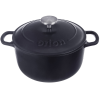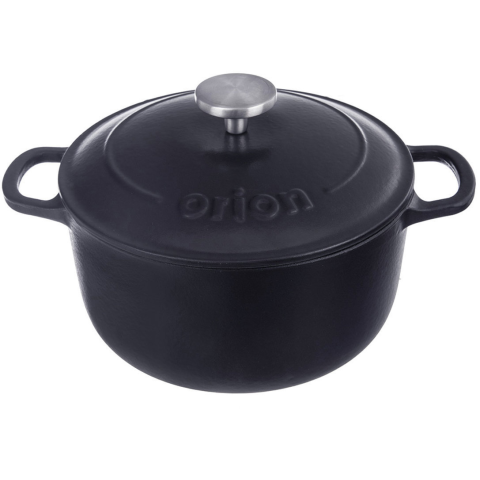 Fazék - zománcozott belső felület, alkalmas gáz, elektromos, indukciós és üvegkerámia főzőlaphoz, alakja kerek, 5,2 l-es kiszerelés, zománc fogantyúval, sütőben használható és mosogatógépben mosható, mérete 11,5 × 34,5 × 26 cm (Ma×Sz×H), átmérője 26 cm, fedő is a csomag része, fekete színben Az 5,2 literes Orion öntöttvas edény tökéletes választás az ételek széles skálájának elkészítéséhez, a pörköltektől a zöldségeken át a kenyérsütésig.