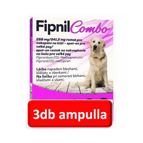 Fipnil Combo 268 mg/241,20 mg rácsepegtető oldat nagytestű kutyáknak A.U.V. Rácsepegtető oldat élősködők ellen nagytestű kutyák számára. Hatóanyagok és egyéb összetevők egy 4,02 ml-es pipettában: Hatóanyagok: - Fipronil 268,00 mg - (S)-metoprén 2