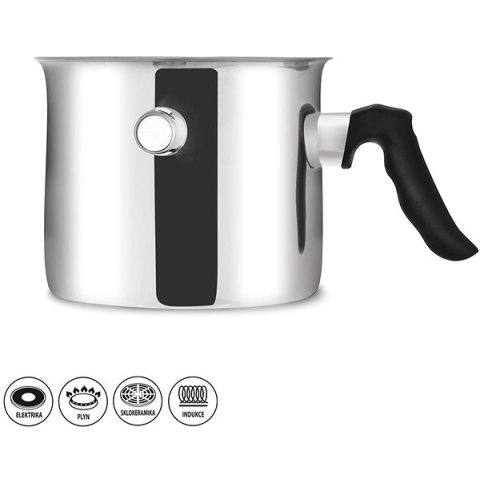 Tejforraló - átmérő 15,5 cm, űrtartalom 1,5 l, hasznos űrtartalom 1,3 l, külső felület rozsdamentes acél, belső felület rozsdamentes acél, műanyag fogantyú, gáz-, elektromos, indukciós és üvegkerámia főzőlapokkal használható Ezen ORION Rozsdamentes acél tejforraló indukciós főzőlaphoz 1,5 l segítségével tejet, kakaót és pudingot is főzhetsz, egyik sem fog odakozmálni. Ennek a praktikus tejforralónak a térfogata 1,5 l, így