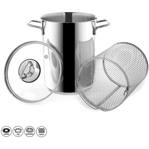 Fazék - rozsdamentes acél belső felület, alkalmas gáz, elektromos, indukciós és üvegkerámia főzőlaphoz, alakja ovális, 4,2 l-es kiszerelés, rozsdamentes acél fogantyúval, dupla és megerősített fenekű, ergonomikus fogantyú, nem éles fémeszköz használatának lehetősége, sütőben használható és mosogatógépben mosható, mérete 21,5 × 23,5 cm (Ma×Sz), átmérője 16 cm, fedő és tészta betét is a csomag része, ezüst színben ORION tésztafőző edény 4,2 lA 16