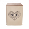 A szögletes, fából készült fedéllel ellátott fémdoboz alkalmas só tárolására. A finom szívdíszítéssel ellátott doboz nemcsak praktikus, hanem szép dísze is a belső térnek.