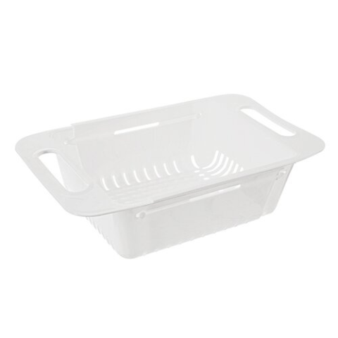 A fehér PP műanyag kosár könnyen elhelyezhető egy normál méretű mosogató tetején. Könnyen meghosszabbítható a kívánt hosszúságra, 32 cm-től 44 cm-ig. Az alján és oldalán található hosszanti nyílásoknak köszönhetően szitaként és lefolyóként is szolgál.