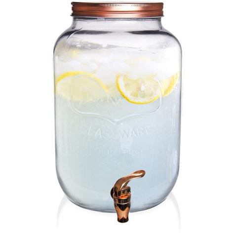 Kulacs - italos üveg folyadék adagoló csappal, különböző parti bólékhoz, gyümölcslevekhez és limonádékhoz alkalmas, széles betöltőnyílás a gyümölcsök egyszerű behelyezése és kivétele érdekében, illetve a tisztítás megkönnyítéséért, menetes fém fedél, anyaga: üveg, fém, műanyag, szilikon tömítés, az adagoló forró italokhoz nem alkalmas, méretek: űrtartalma 8,8 l, 20×20×31,5 cm Ha praktikus kiegészítőt keresel a nyári ünnepségekhez, akkor az O