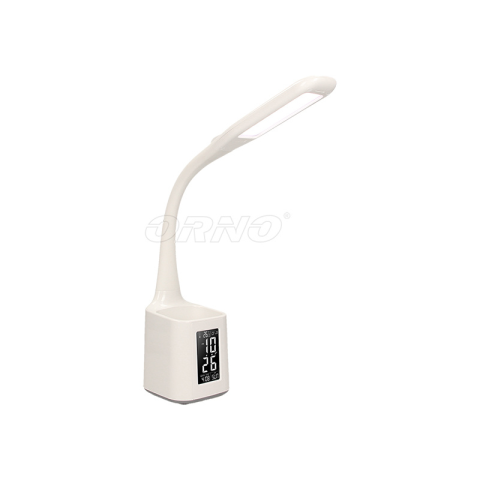 ORNO Asztali lámpa ceruza tartóval, kijelzővel, ébresztő funkcióval óra-, dátum-, hőmérséklet kijelzés °C/°F, 3 fokozatban állítható LED megvilágítás, állítható fejjel, 26db LED SMD2835, órához elem CR2032, Lámpához 100-240Vac, 50/60Hz, DC5V, 1A, 6W, 200lm, 4000K semleges fehér, IP20,