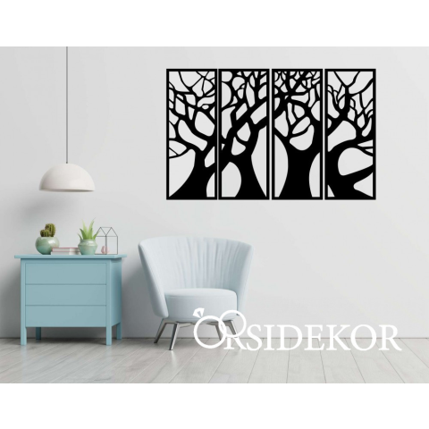 Ez a lézervágott, 4 részes fatörzs falikép fából készült modern lakberendezési tárgy, amely elegáns módon idézi az erdő hangulatát. Natúr rétegelt fa alapanyag, amely bármilyen színre festhető fa páccal vagy akrillal. A falikép könnyen felszerelhető, nem