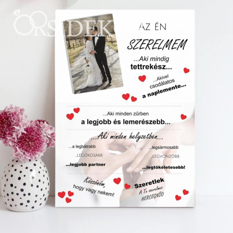 Esküvőtök alkalmával lepd meg vőlegényed egy kimondottan neki készített ajándéktáblával! Ezzel az ajándékkal mégjobban megmuthatod szereteted és hogy mit szeretsz benne igazán. A tábla mérete 21x29cm. A szöveget és a rajta lévő képet kérésed szerint ala