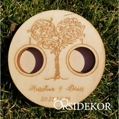 Igazán egyedi dolgot szeretnél? Akkor jó választás ez a gravírozott, kör alakú fa gyűrűhordozó. Általában akad a rokonságban olyan kisgyerek, aki szívesen vállalja a gyűrűhordozó szerepét, ez a praktikus megoldás biztosítja, hogy a gyűrűk kreatív módo