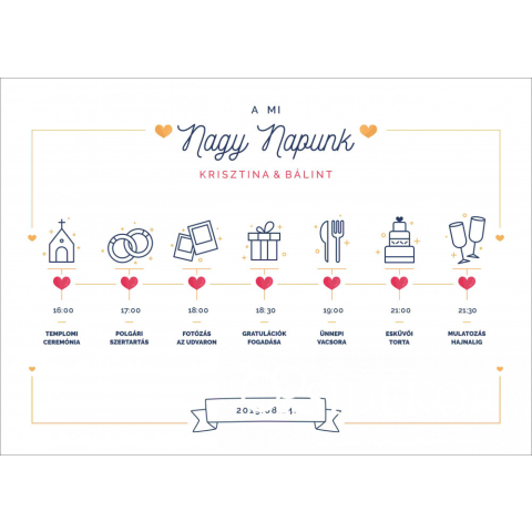 Egy gondosan megtervezett Program táblázat segít a vendégeknek eligazodni az esküvő menetrendjében. Nem tesznek fel felesleges kérdéseket az ifjú párnak, mert tudják, hogy mikor mi következik a nagy napon. A nyugodt és jó hangulatért cserébe megéri a fár