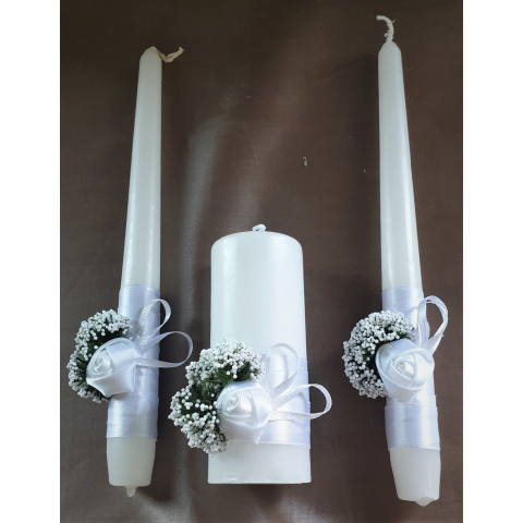 Gyertyaszettünk egy kézzel díszített vastag és két vékony, magas gyertyából áll. Elegáns virágokkal és szalaggal díszítettük. Ajánlott alkalmak: esküvői polgári szertartásra Ha a gyertyaszett díszítése megtetszett, de más színben szeretnéd azt, jelezd k