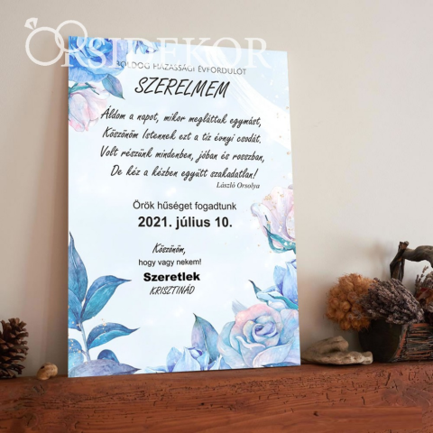 Közeleg a házassági évfordulótok? Lepd meg párod ezzel az egyedi, személyre szóló ajándékkal. A tábla mérete 21x29cm. A szöveget kérésed szerint alakítjuk. Fontos! A szövegek pozíciójának módosítására nincs lehetőség.