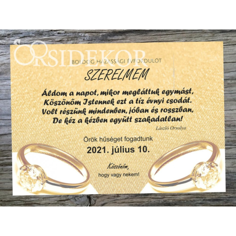 Közeleg a házassági évfordulótok? Lepd meg párod ezzel az egyedi, személyre szóló ajándékkal. A tábla mérete 21x29cm. A szöveget kérésed szerint alakítjuk. Fontos! A szövegek pozíciójának módosítására nincs lehetőség.